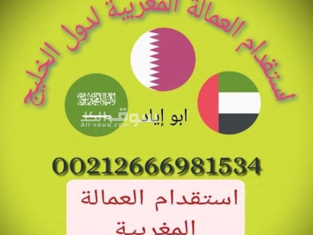 مكتب ابو إياد بالمغرب لاستقدام العمالة المنزلية المغربية لدول الخليج . مكتبنا يوفر لكم عمالة منزلية . طباخة منزلية . مرافقة للمسنين . مربيات اطفال . كوافيرات . مقدمات الطعام . نادلات كوفي . عاملات تنظيف . مندوبات مبيعات . خياطات . والكتير من انواع العمالة المتوفرة لدينا . للتواصل معنا نحن دائما رهن اتصالكم بنا .