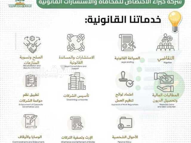 تقدم كافة الخدمات القانونية في جميع القضايا والمطالبات المالية وترحب بالتعاون مع جميع الشركات والمصانع والمؤسسات والافراد من قبل فريق عمل من المستشارين القانونين والاداريين والتنفيذيين