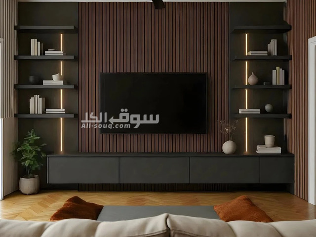 Transform your living room into a sophisticated haven with the Eclipse Slatwall Mounted TV Unit, blending minimalist elegance with functional storage. Featuring a dramatic vertical slat backdrop in a rich, earthy tone, this wall-mounted design centers a large flat-screen TV flanked by asymmetrical floating shelves illuminated by sleek LED strips. The lower console offers concealed storage behind matte doors, perfect for tucking away remotes and media players. Ideal for modern interiors, it creates a balanced focal point that enhances ambiance with subtle glows and curated display spaces for books, plants, and accents. Effortless to mount and versatile for any wall, it’s where style meets everyday utility.